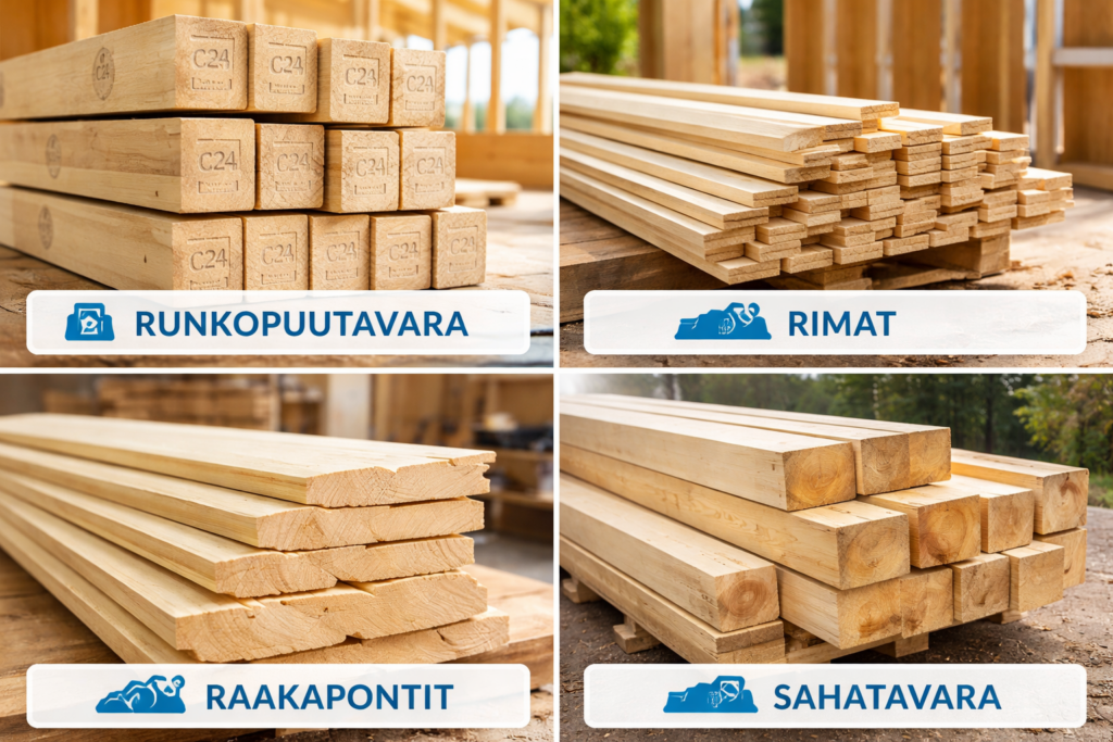 C24-lujuuslajiteltu runkopuutavara kantaviin rakenteisiin, kuten talojen runkoihin, kattoihin ja välipohjiin.